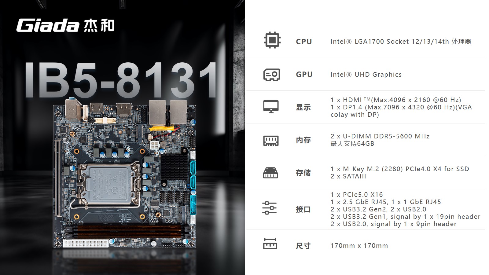 k8·凯发(国际)Mini-ITX主板IB5-8131采用Intel® B760芯片组,支持Intel® LGA1700 Socket第12/13/14代CPU。支持1 x HDMI (Max.4096 x 2160 @60 Hz);1 x DP1.4 (Max.7096 x 4320 @60 Hz)(保留 VGA位置)。