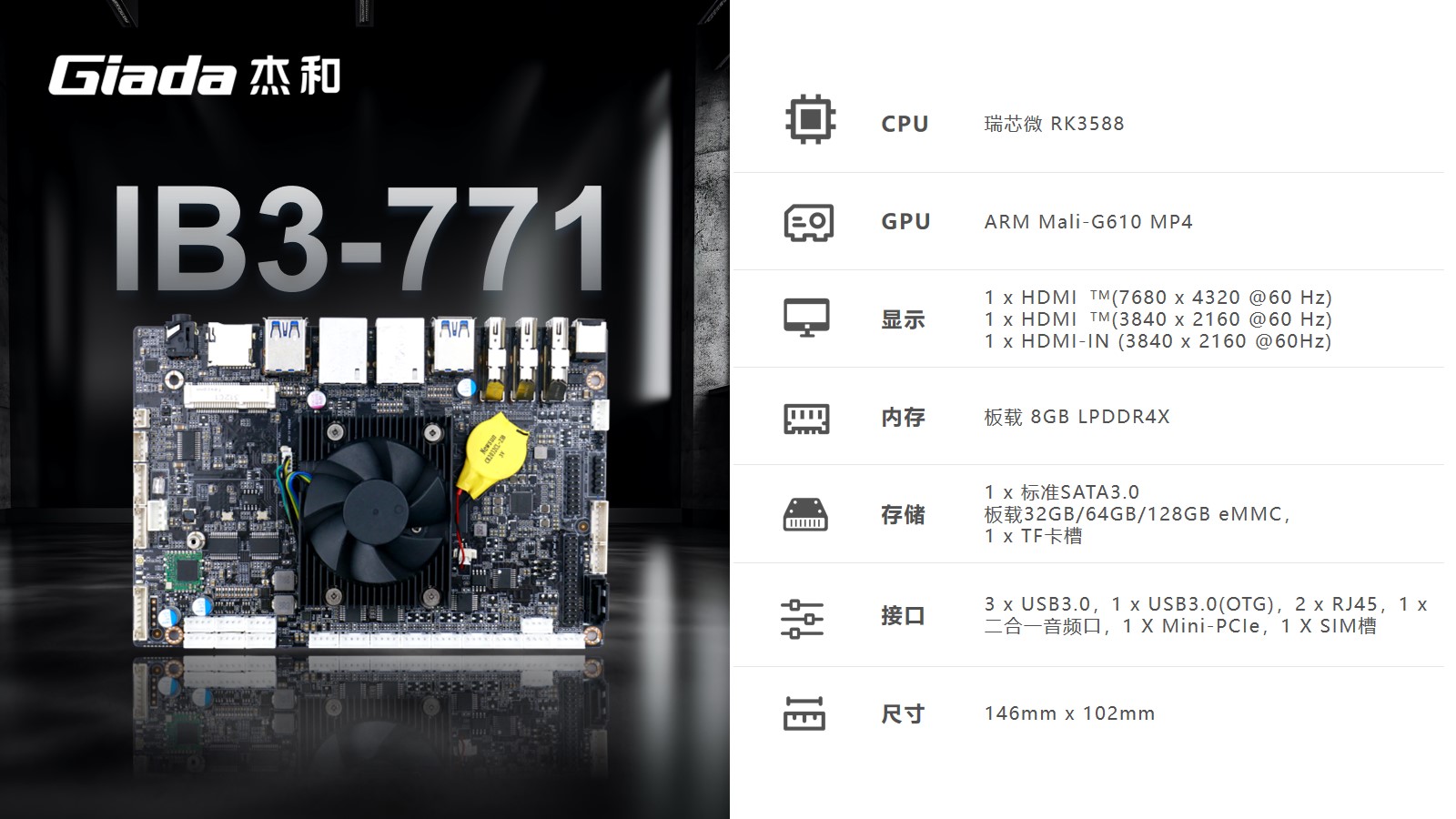 k8·凯发(国际)工业级ARM主板IB3-771采用瑞芯微RK3588处理器,内置G610 MP4 GPU,拥有6 TOPS算力的NPU,支持8K视频硬件解码编码及多摄像头输入,支持eDP/DP/ HDMI2.1/MIPI 多种显示接口。