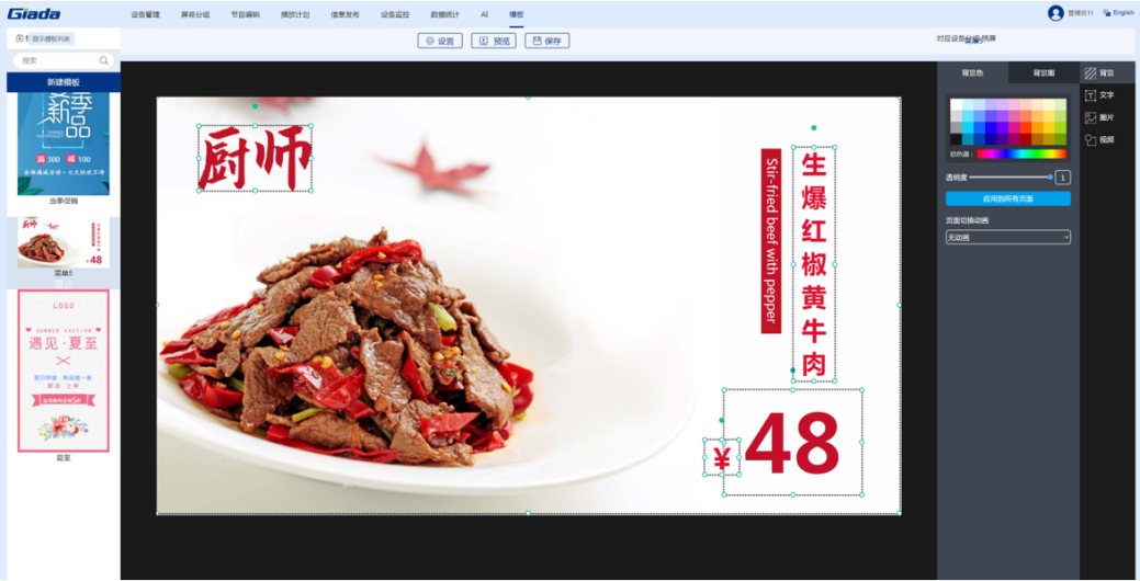 k8·凯发(国际)科技智慧餐厅综合解决方案是由智能零售管理系统搭载公司自研的数字标牌播放器组成的软硬件一体化方案。该系统针对餐厅、酒店等不同行业提供典型节目模板,支持手机、电脑建议操作。用户只需3步即可完成节目的制作播放:选择节目模板,更换自己的素材(视频、图片和文字),预览保存及播放。价格、优惠折扣等信息可随时更改。