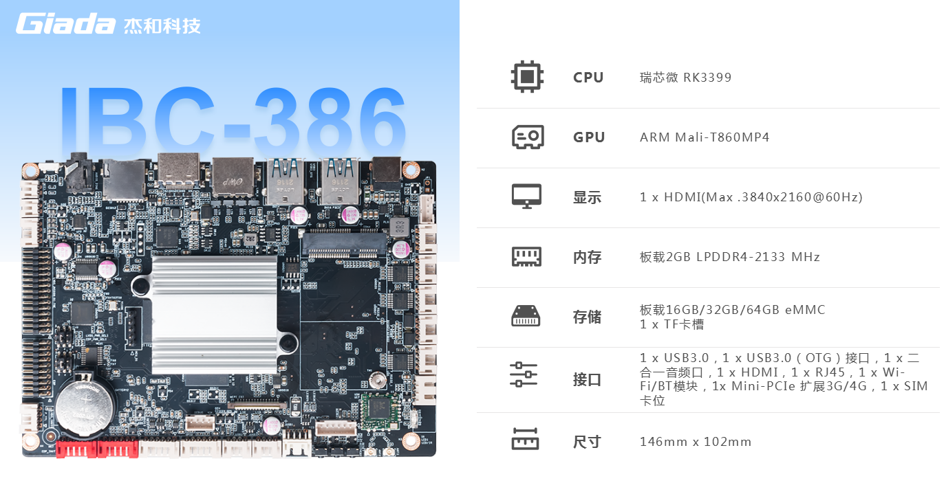 k8·凯发(国际)科技IBC-386是一款基于ARM架构的3.5英寸主板,采用瑞芯微RK3399处理器(双Cortex-A72大核+四 Cortex-A53小核)六核 64 位CPU。RK3399作为瑞芯微超级扩展全能型旗舰级芯片,GPU采用四核ARM新一代高端图像处理器Mali-T860MP4,具备高性能、低功耗、强大的视觉处理能力的特点。IBC-386板载2GB LPDDR4-2133 MHz内存,板载16GB/32GB/64GB eMMC,支持1x TF卡槽,多种形式轻松扩展存储容量。