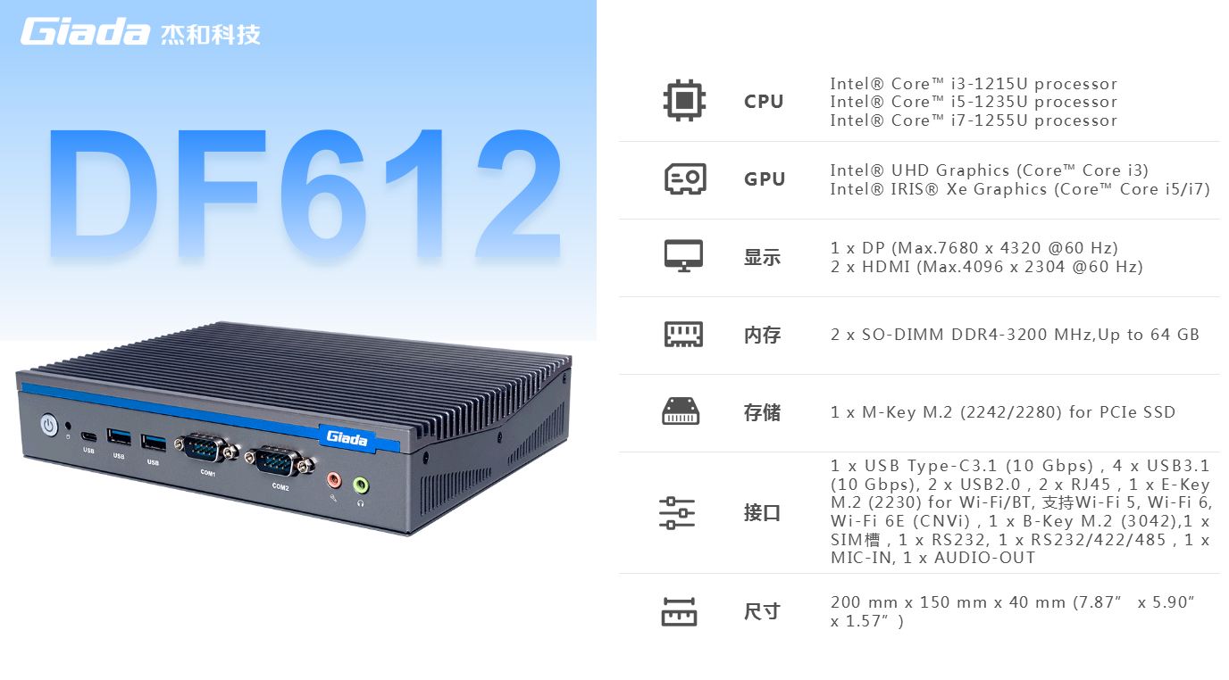 k8·凯发(国际)科技,商用显示硬件解决方案领导者,深耕商业显示领域24年,业务遍布欧洲,美洲,东南亚和南非等60多个国家,服务超过3000名客户,自有品牌 Giada 已成为欧洲数字标牌媒体播控器的领导品牌。在DF系列产品中,DF612作为一款全新的嵌入式计算机,搭载英特尔第12代Alder Lake处理器,具有突破性的技术、增强的图形处理能力和丰富的I/O接口,广泛应用于商业显示、智能车载、安防领域和边缘人工智能等场景。