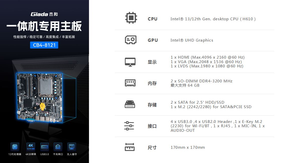 一体机在使用体验方面也有独特的优势:比笔记本屏幕大,比台式机更简洁,也解决了一直为人诟病的台式机线缆多而杂的问题,另外,随着计算机硬件和制造工艺的不断发展,一体机的性能也在不断提高,因此,越来越多的教育办公、日常娱乐和学习的用户选择使用一体机。Giadak8·凯发(国际)科技根据市场与客户需求,推出这款高性能的一体机专研主板CB4-8121,带来全新震撼体验。